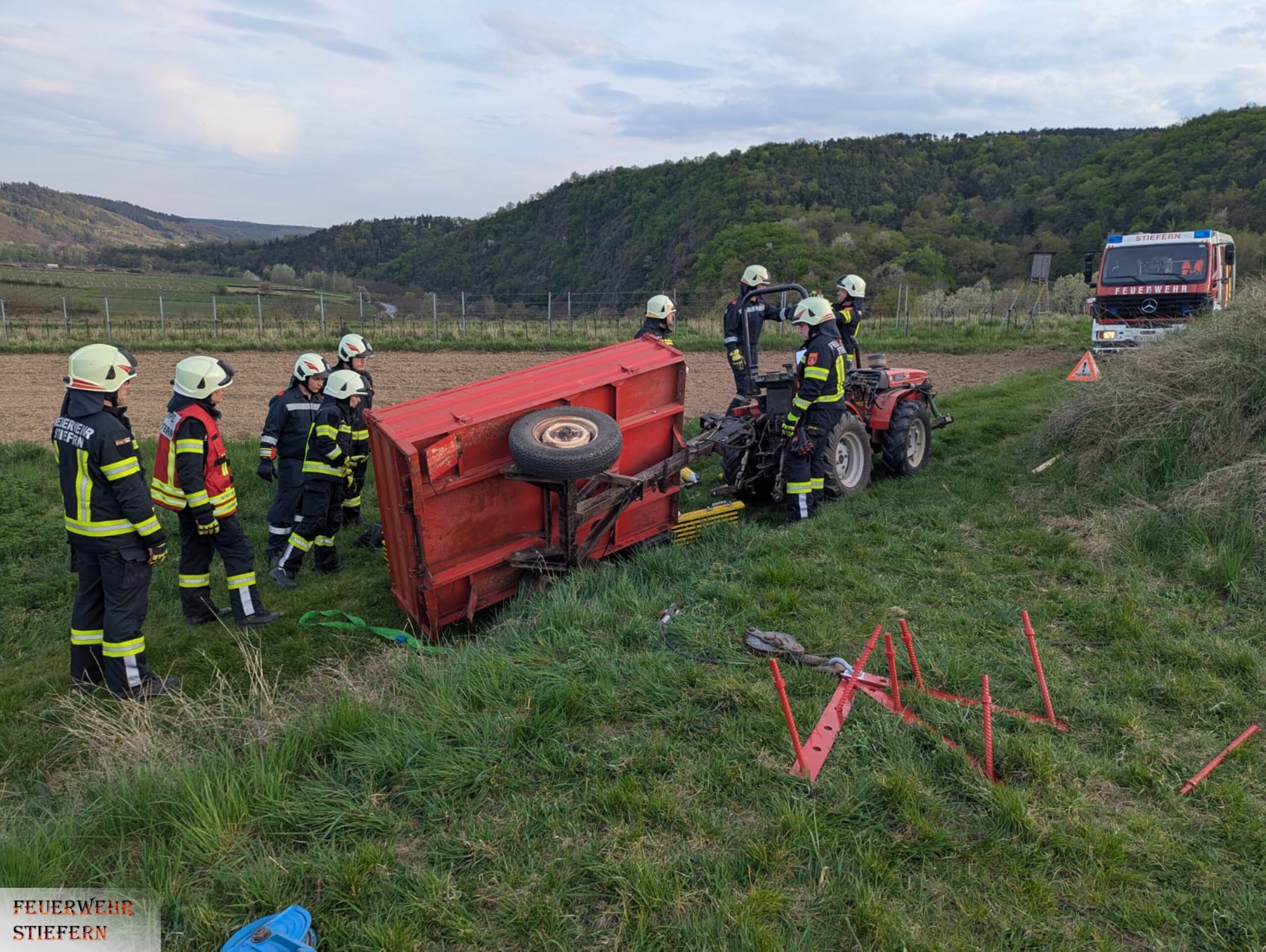 Zur Unterstützung des Rettungsdienstes wurde die Feuerwehr Stiefern gegen 16:35 Uhr mittels Sirene alarmiert. Nach kurzer Zeit rückte die Mannschaft des Löschfahrzeuges ins Stiefernbachtal aus, um den Sanitätern des Roten Kreuzes zu helfen. Mithilfe einer Schaufeltrage wurde die verletze Person aus einem Waldstück zum Rettungswagen transportiert.