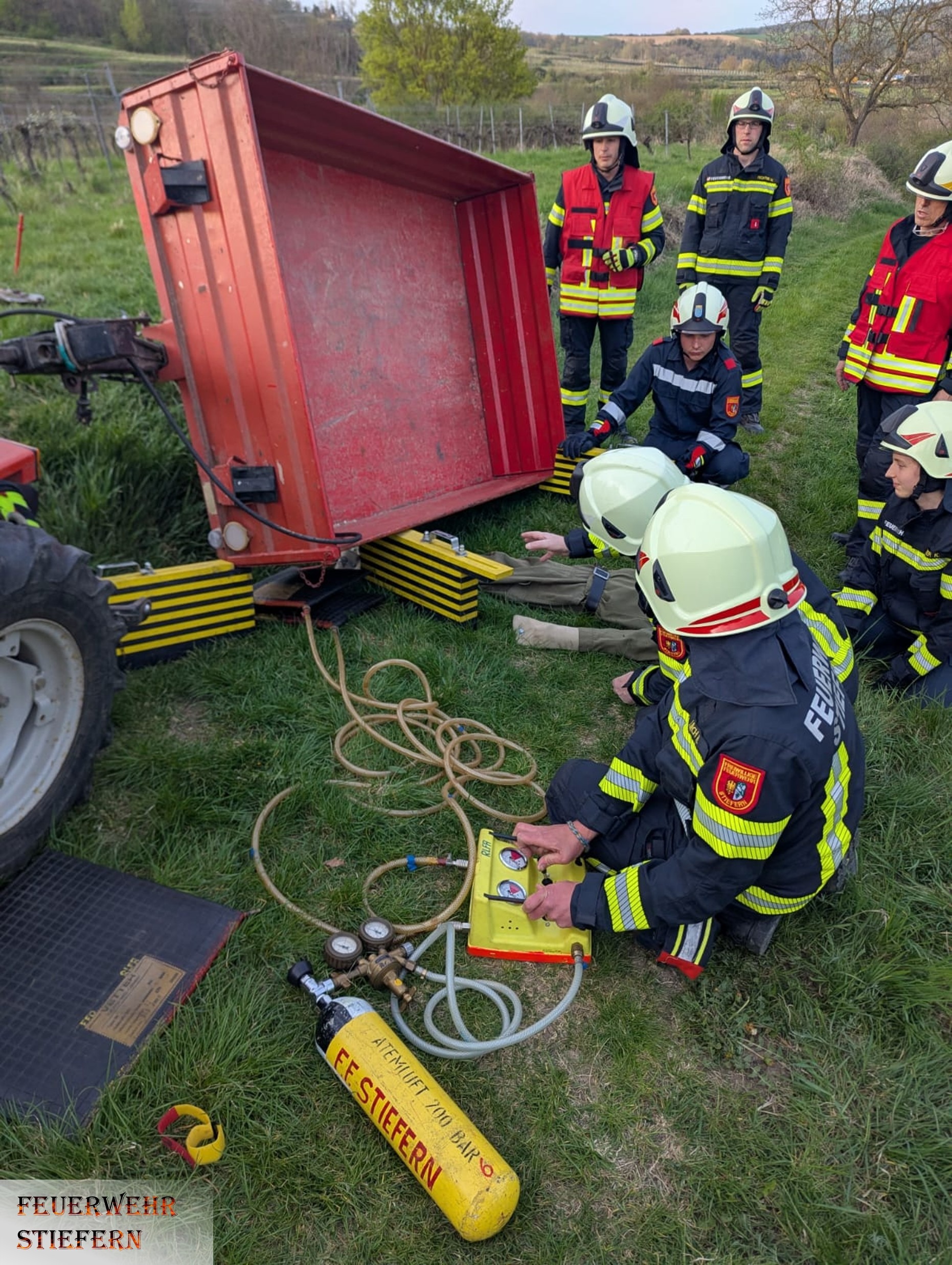 Am Samstag Abend fand eine technische Übung statt. Das Übungsszenario stellte einen realistischen Traktorunfall nach, bei dem der Anhänger des Fahrzeugs umkippte und eine Person darunter eingeklemmt wurde.
